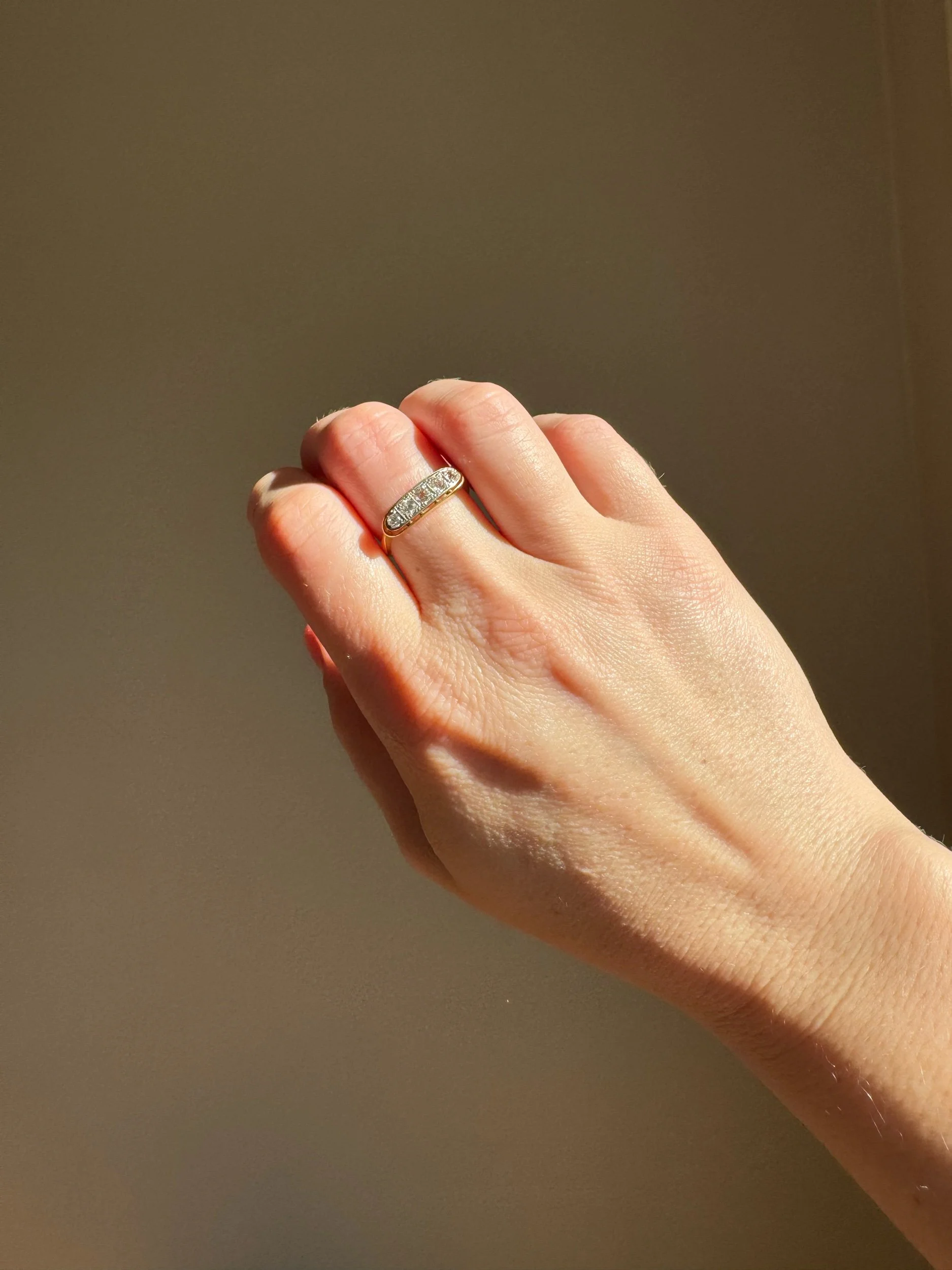 A beautiful expression of antique craftsmanship, this 18K yellow gold and platinum ring showcases a design that feels both rare and timeless. The elongated face is set with five diamonds, four of which were cut by hand, blending old-world charm with subtle individuality. One of the diamonds was replaced at some point with a round brilliant cut.